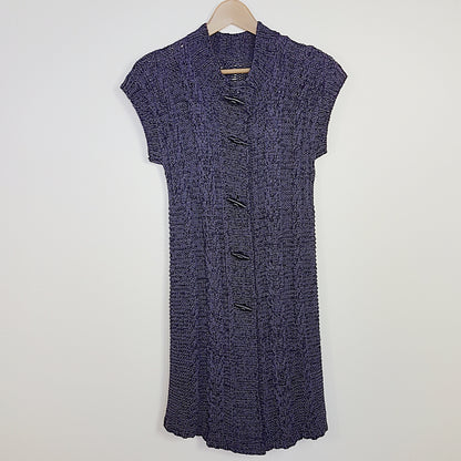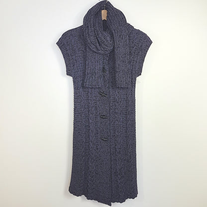 The shrug/sleeves is knitted in one piece with the same yarn combination. When wearing as a coat, the shrug is donned first, followed by the vest over the top.