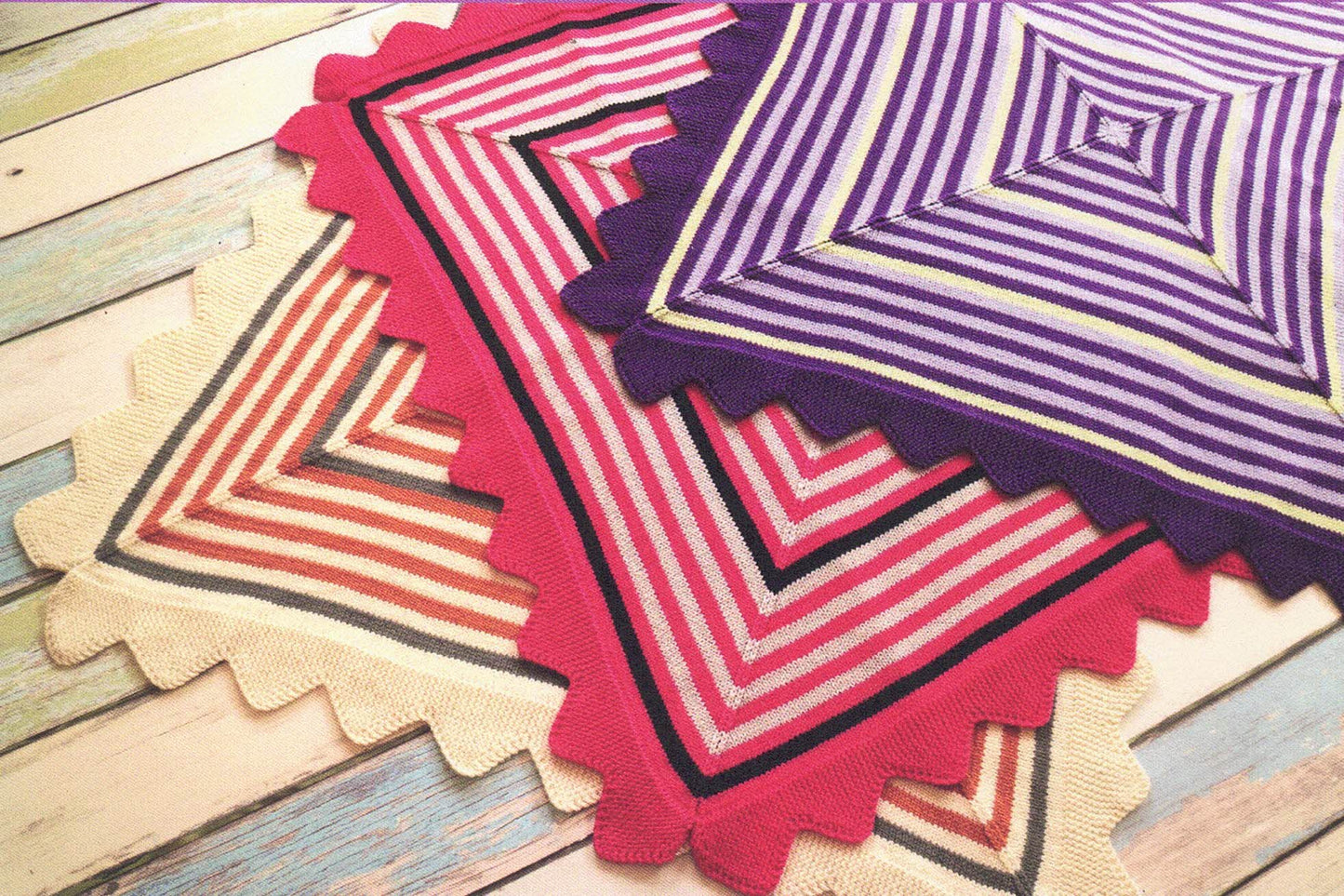 Four separate wedges are knitted, beginning with zig zag edge worked sideways then picking up stitches along the straight edge to complete stripe rows.