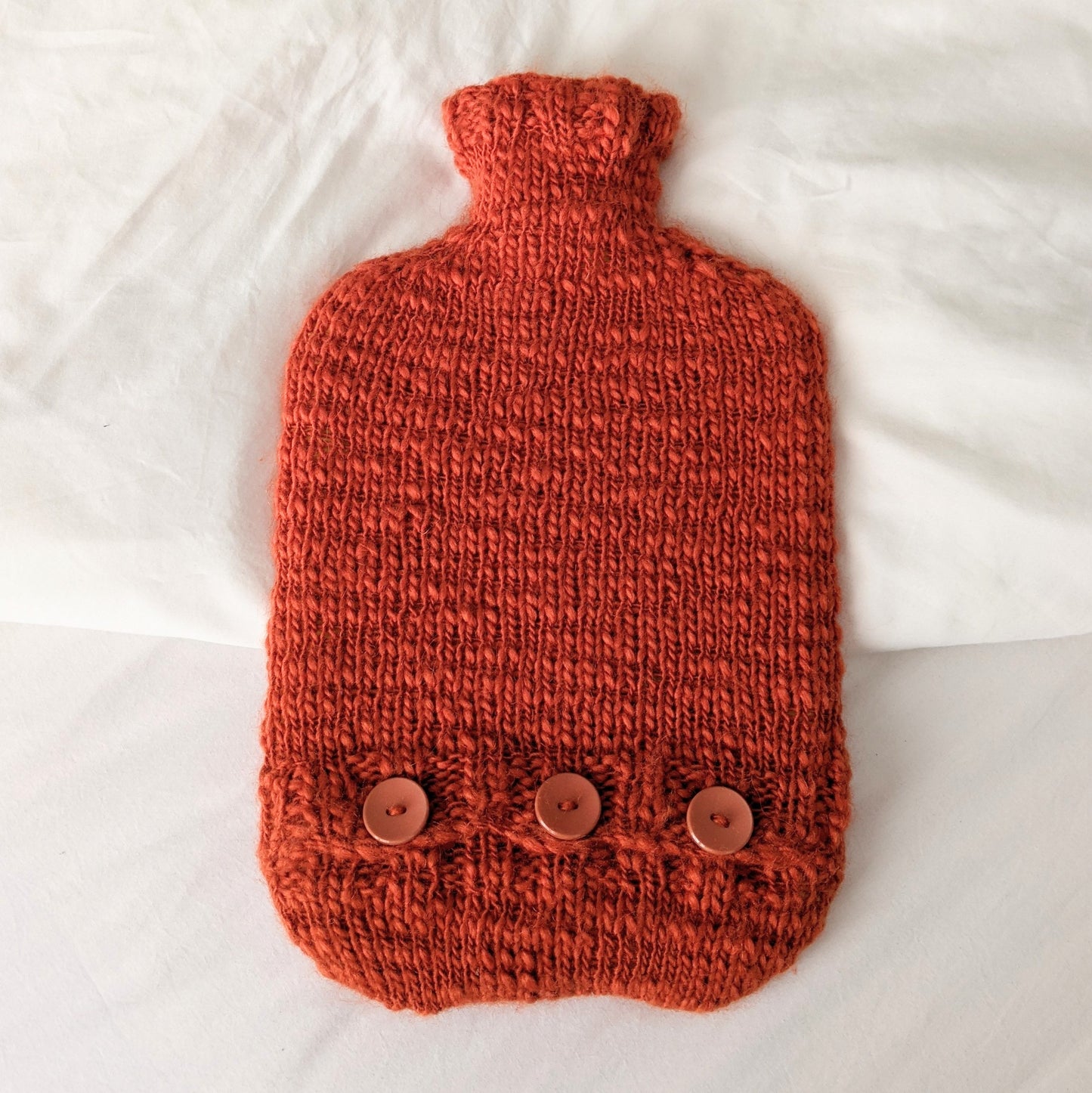 This cover is made for a standard Hot Water Bottle that measures approx 30cm long and 20cm wide. Starting at the base and working up the body to the neck, it’s knit all in one piece so there’s very little sewing up.