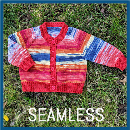 This simple top-down baby’s cardigan is the perfect pattern to feature beautiful yarn. It includes the options of using two colours – a main colour body with contrasting bands, using stripes for the body, or using just one yarn throughout. This pattern is worked in one piece with no sewing – just the ends to do at the end! This is the sibling pattern to Adrian 4ply Baby Cardigan, which is the minimally-seamed version of Baby Amanda.
