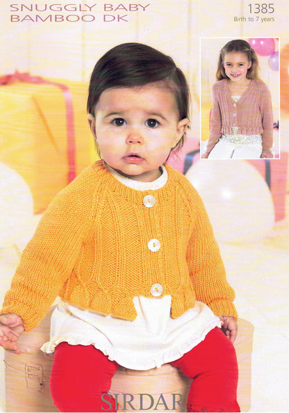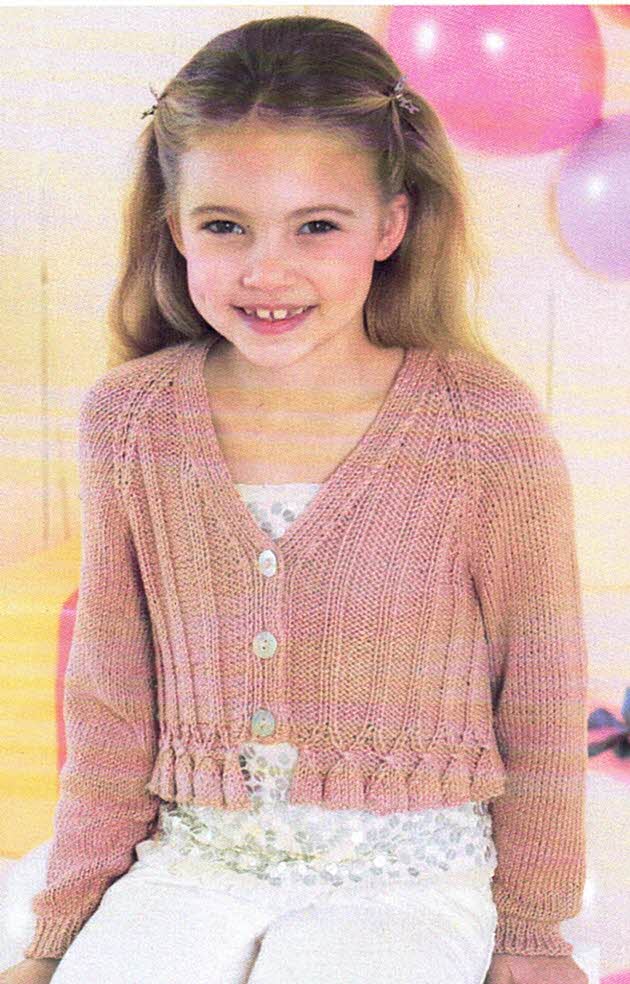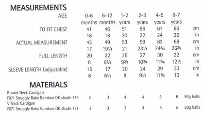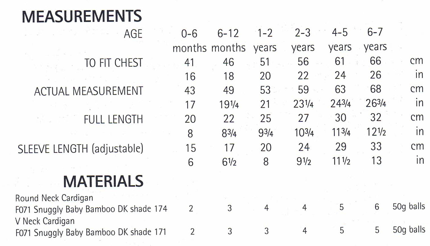 Round or V Neck cardigan in sizes 0-6 months; 6-12 months; 1-2 years; 2-3 years; 4-5 years; and 6-7 years. Knitted in 8 ply/DK yarn.
