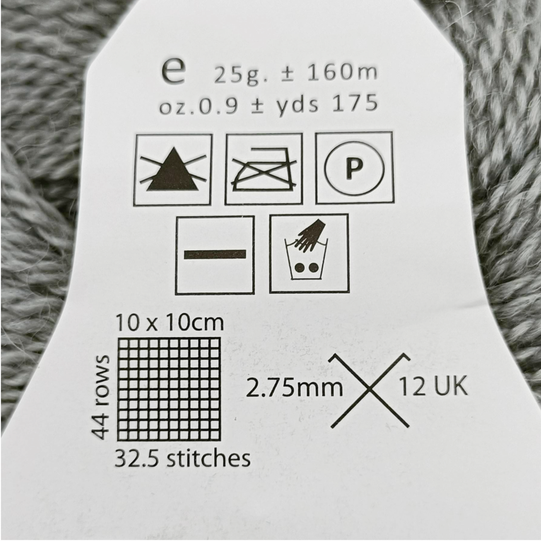 25g, approximately 160m, 32.5 stitches x 44 rows over 10cm on 2.75mm needles, 50% alpaca, 25% wool, 15% silk, 10% cashmere. Gentle hand wash.