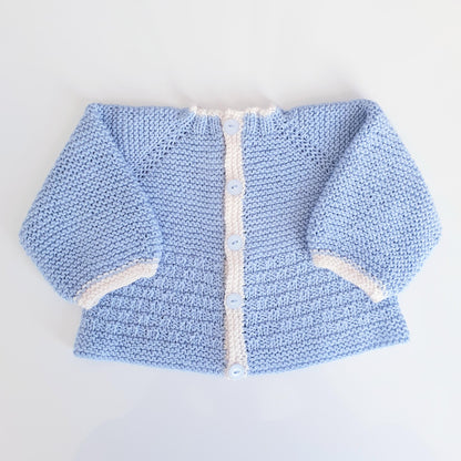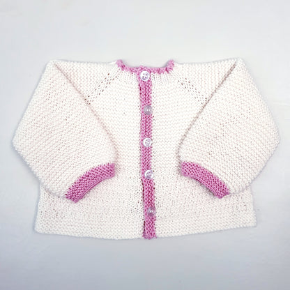 This easy to knit garment is worked from the neck down. The rib neck is followed by a garter stitch yoke and garter basketweave stitch body. The raglan shaping of the shoulders takes place with increases on either side of what would normally be the shoulder seams. As the sleeves are worked in the round, the entire garment does not need any seams to be sewn together.
