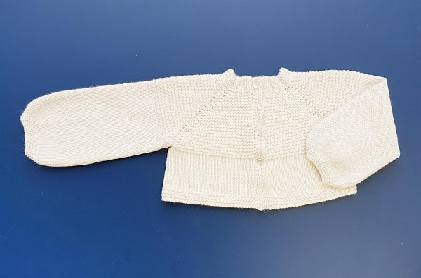 This easy to knit garment is worked from the neck down. The rib neck is followed by a garter stitch yoke and stocking stitch body. The raglan shaping of the shoulders takes place with increases on either side of what would normally be the shoulder seams. As the sleeves are worked in the round, the entire garment does not need any seams to be sewn together.