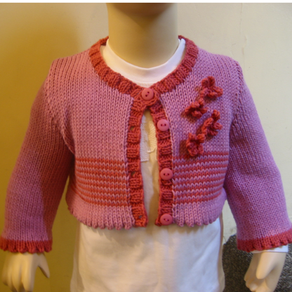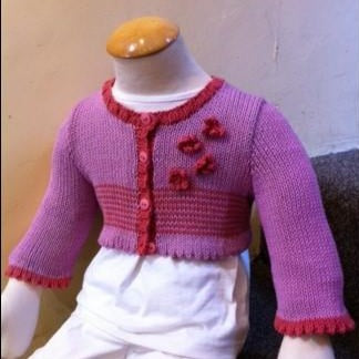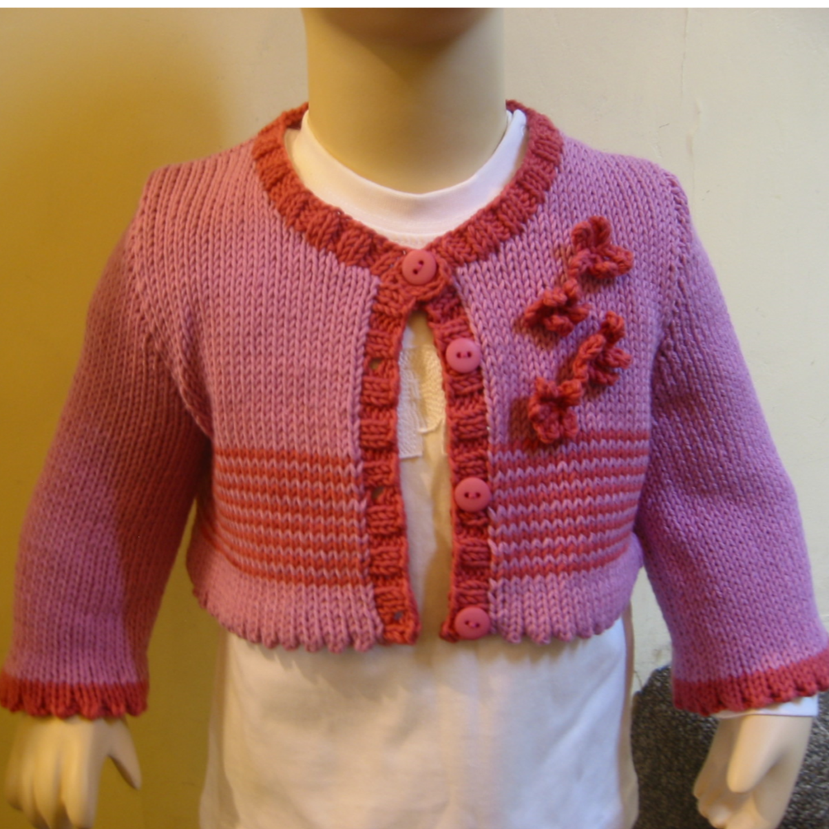 This sweet cropped cardigan is knitted in Adorn Cotton Cashmere DK and has single row stripes and scalloped hems.