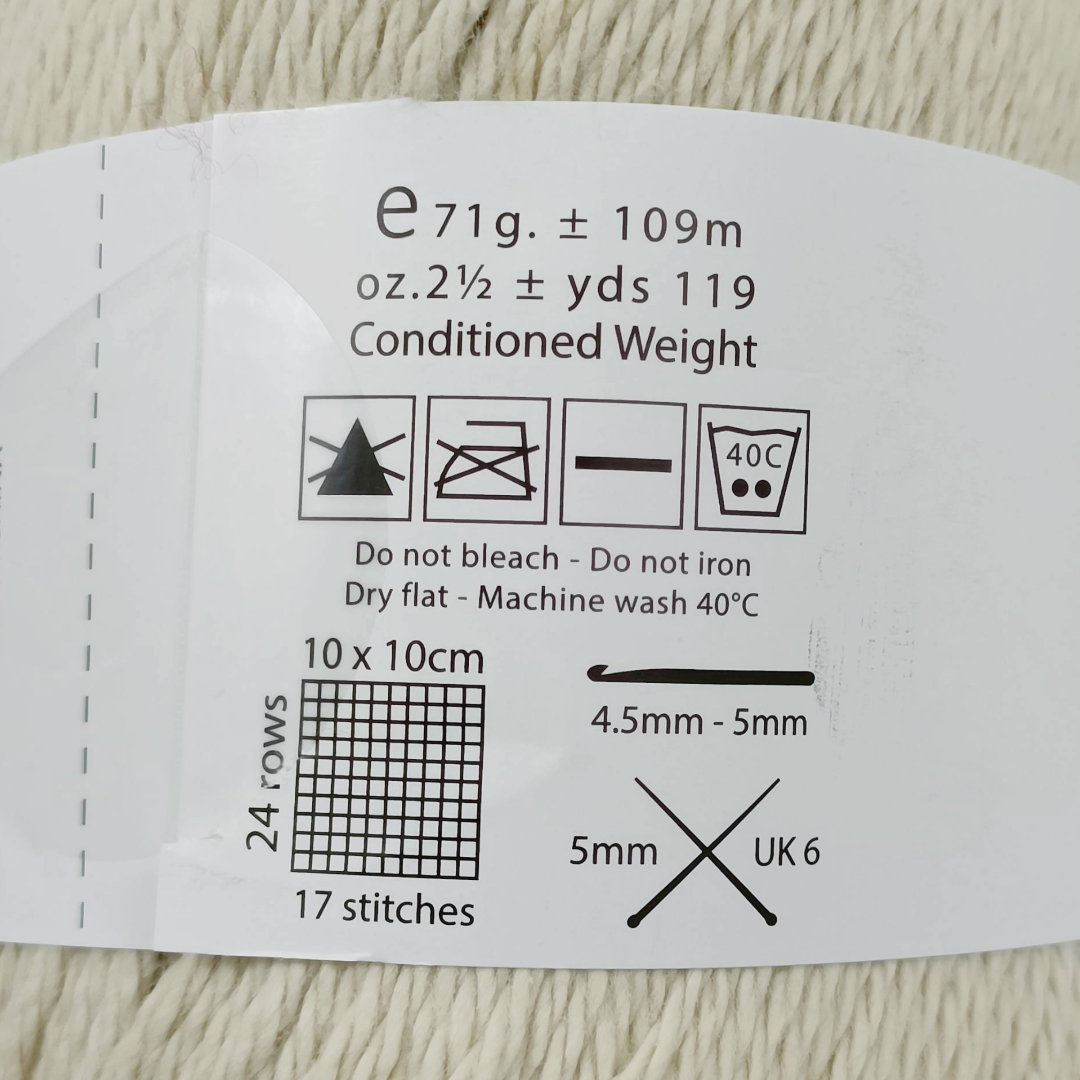 71g; Approx 109 metres; Tension 17 sts x 24 rows over 10cm on 5mm needles. 100% Cotton 10 ply. Machine washable.