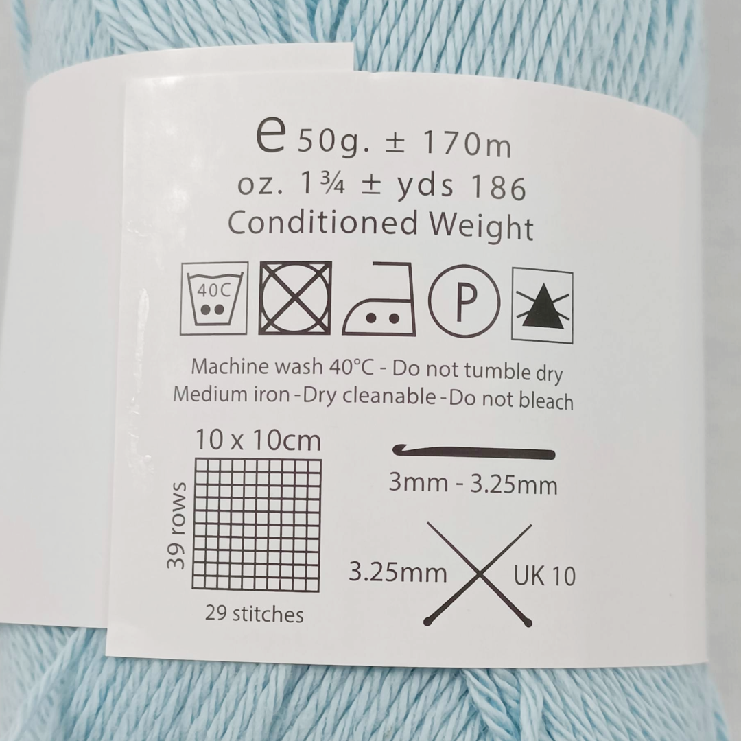 50g; Approx 170 metres/ 186 yards; 29 sts x 39 rows over 10 cm on 3.25mm. 100% Cotton.