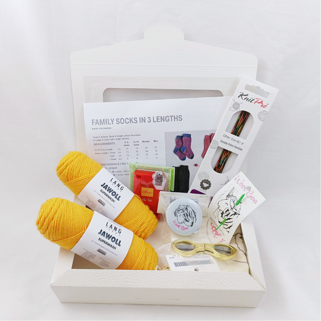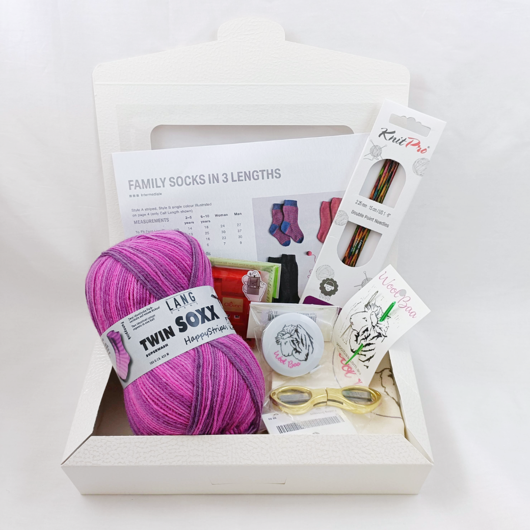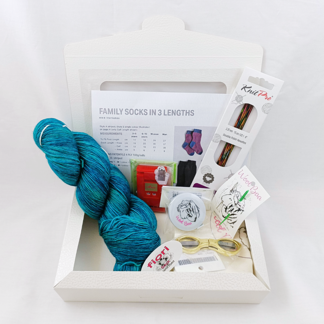 In a Wool Baa kit box, you get everything you need to create the project: yarn, needles, scissors, row-counter, tape measure, wool needle, project bag and of course, the pattern. Just choose your preferred yarn for the kit, go to the cart and put the colourway in the special instructions box, and we'll put together the kit for you. Or leave the colour selection to us and it will be a surprise for you!