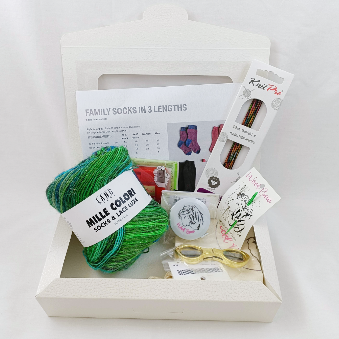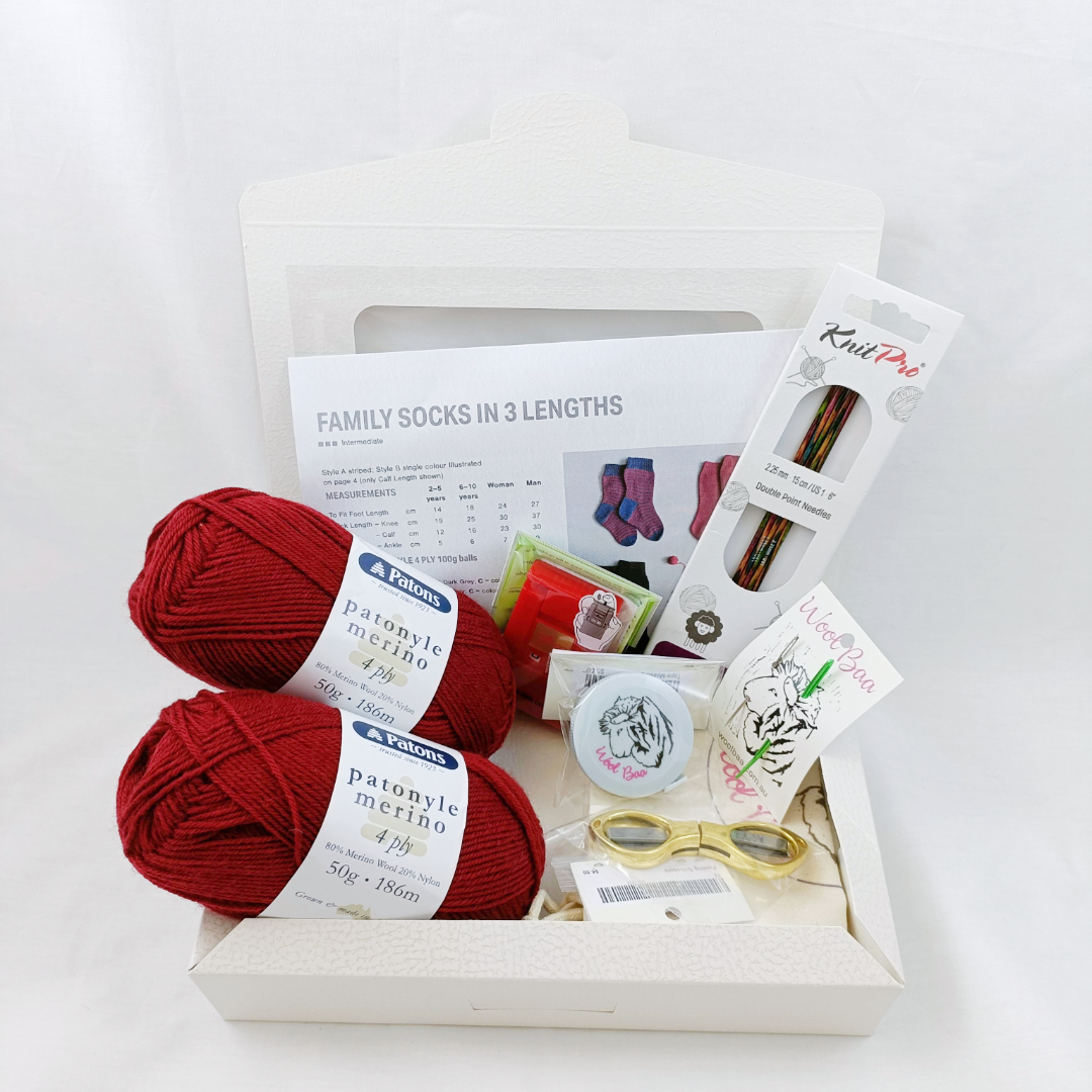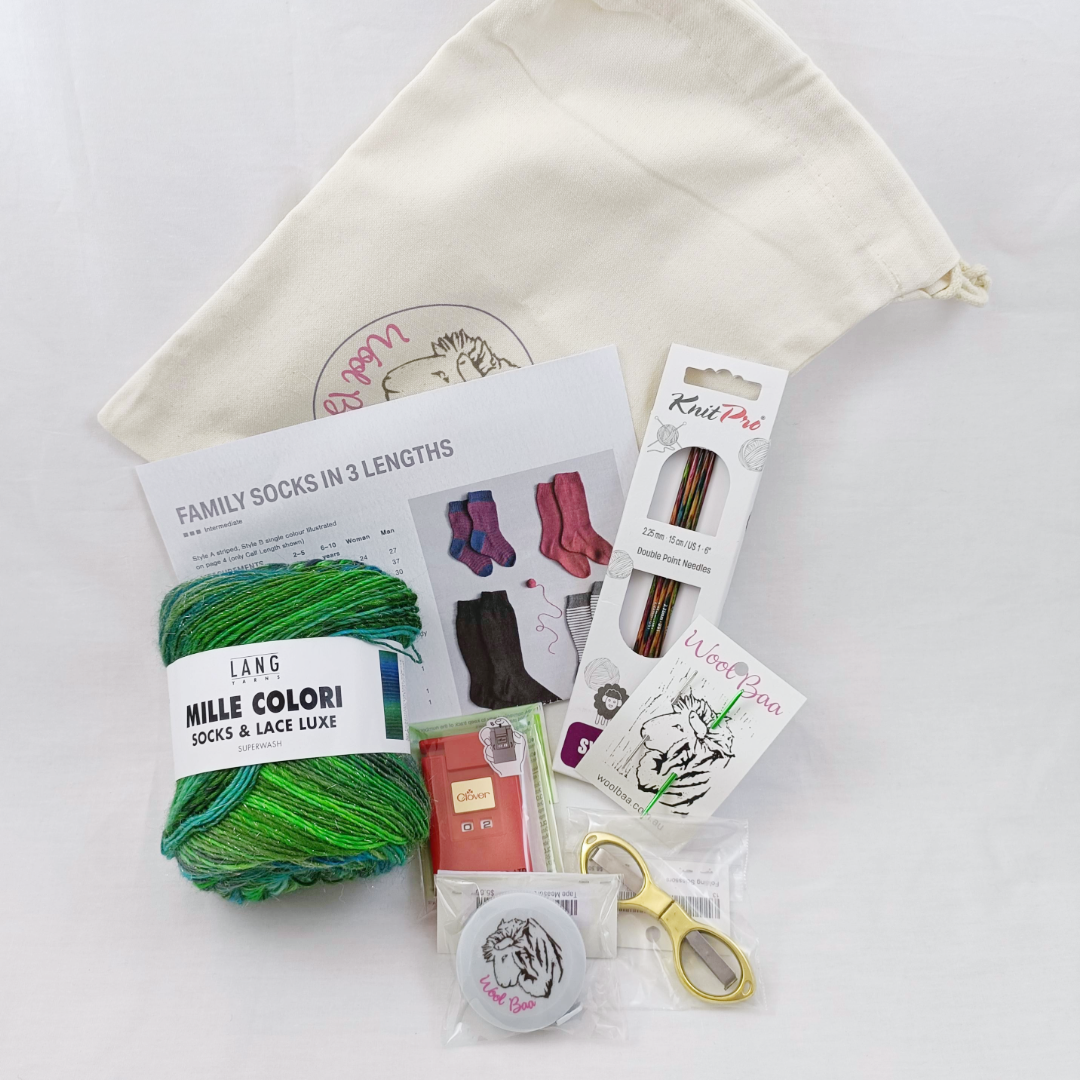 In a Wool Baa kit box, you get everything you need to create the project: yarn, needles, scissors, row-counter, tape measure, wool needle, project bag and of course, the pattern. Just choose your preferred yarn for the kit, go to the cart and put the colourway in the special instructions box, and we'll put together the kit for you. Or leave the colour selection to us and it will be a surprise for you!