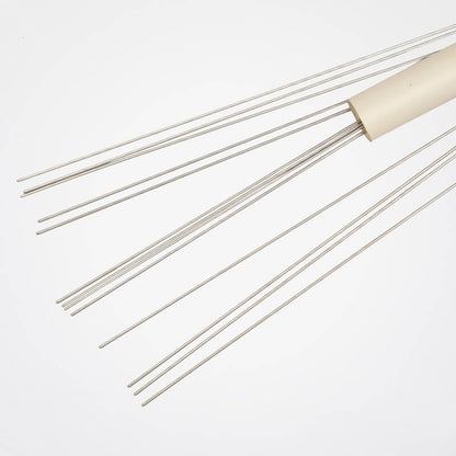Rust resistant stainless steel wires provide even tension for blocking lace shawls, scarfs etc. This kit contains 6 wires in length of 95 cm, 6 wires in length of 50 cm, 3 flexible wires in length of 95 cm, 20 T-pins and 1 measuring tape.