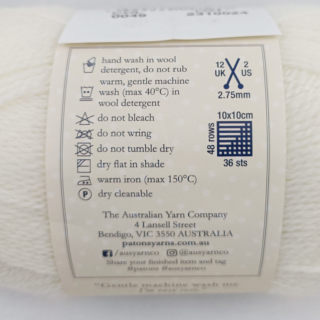 50g; Approx 335metres; 100% Australian Merino Wool. 36 sts x 48 rows over 10cm on 2.75mm needles. Warm gentle machine wash.