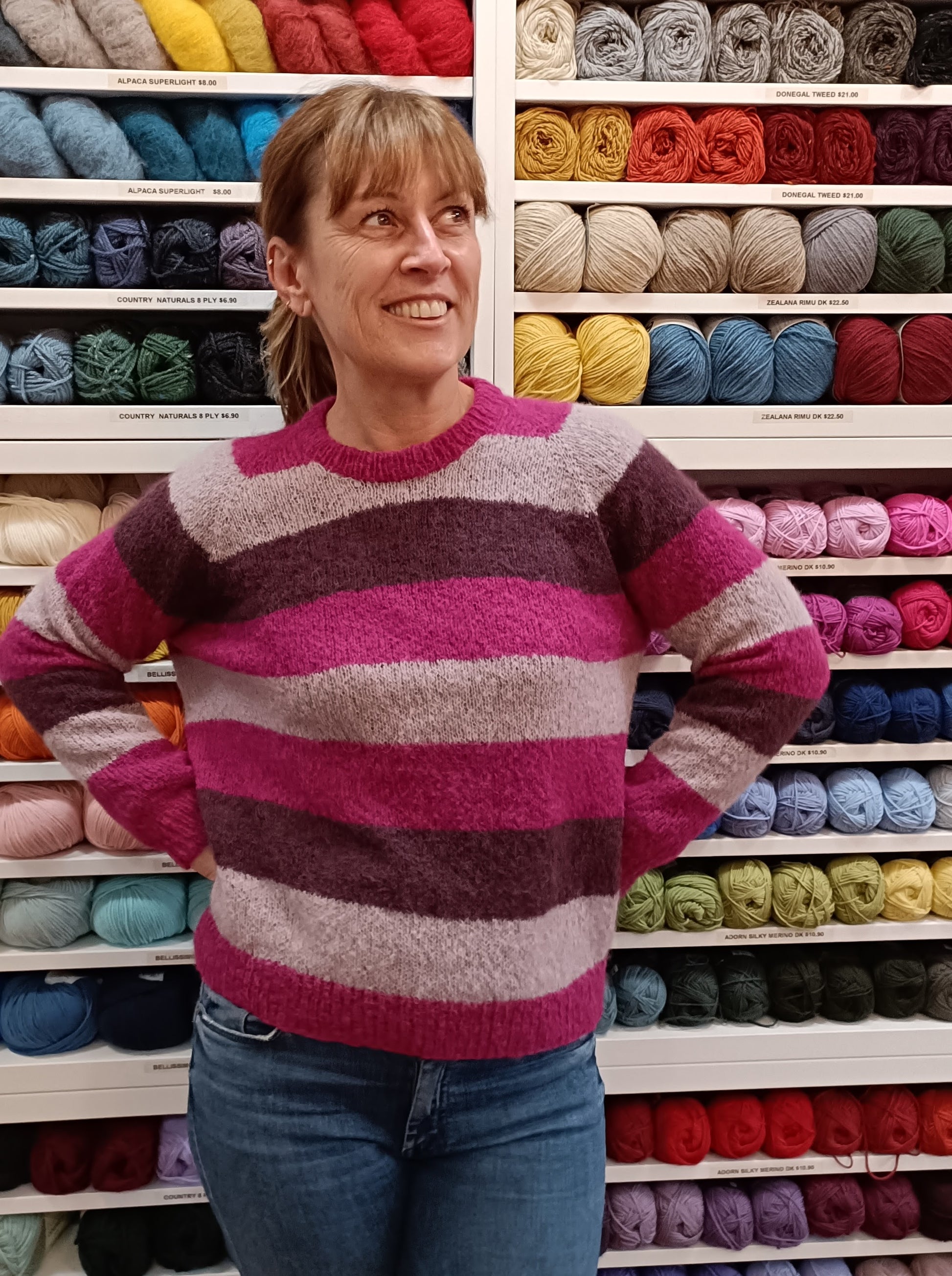 Pictured in size M, knitted in Lang Alpaca Superlight, in 0066 Raspberry, 0248 Antique Rose and 0280 Burgundy. Many thanks to Alex for modelling.