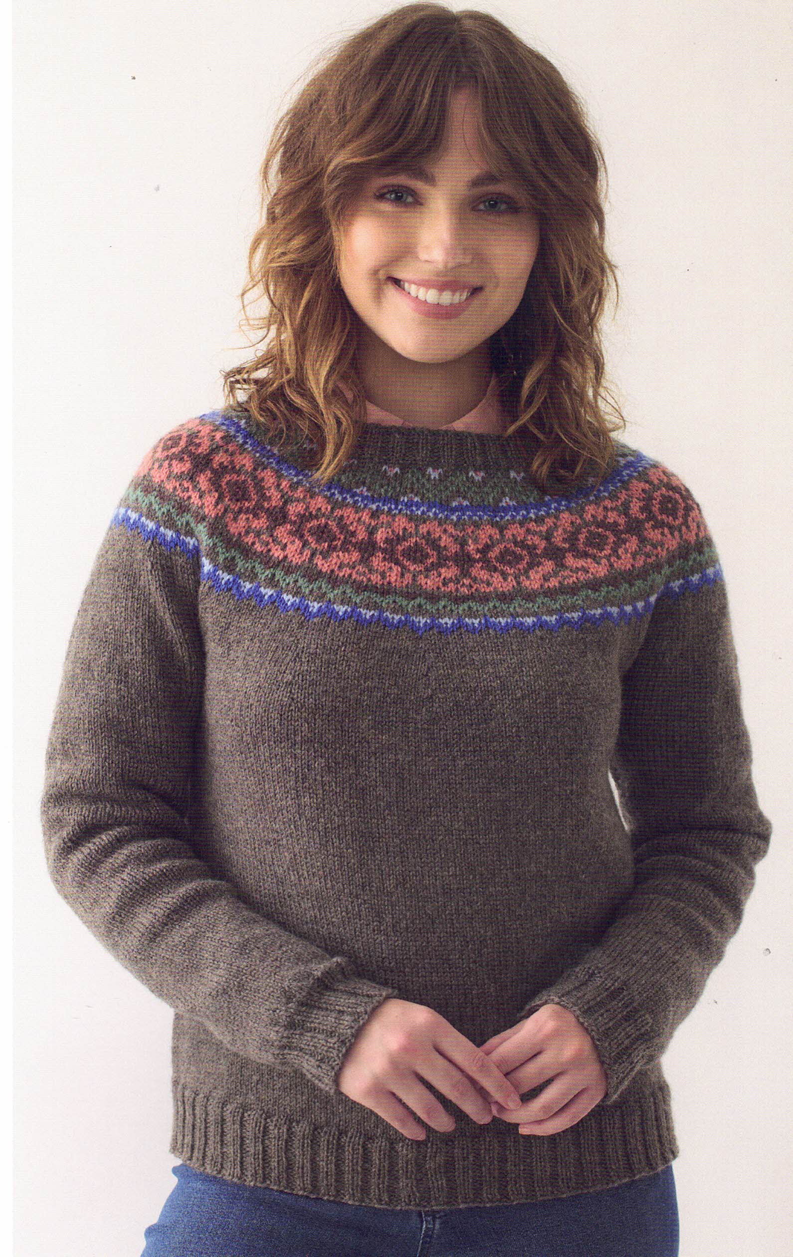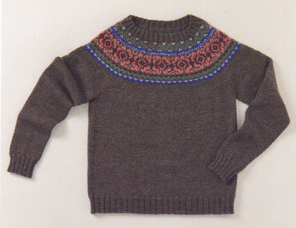 Top down circular yoke knit in Country 8 ply. This pattern is for the advanced knitter. It comes in sizes S (80cm), M (90cm), L (100cm), XL (110cm) and XXL (120cm). The pattern takes 11, 12, 14, 15 and 17 balls in main colour and 1 ball of each of 5 contrast colours.