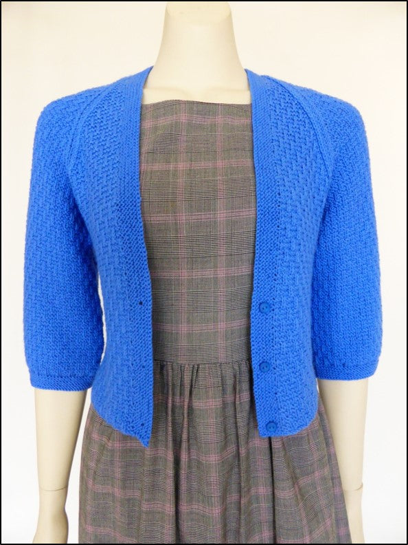 This semi bolero garment has 3/4 raglan sleeves with a slightly shaped cuff and is designed to be worn open at the front. It can be stretched and buttoned shut for a fitted shape. It is knitted in Adorn Silky Merino 4ply with a simple garter basketweave pattern.
